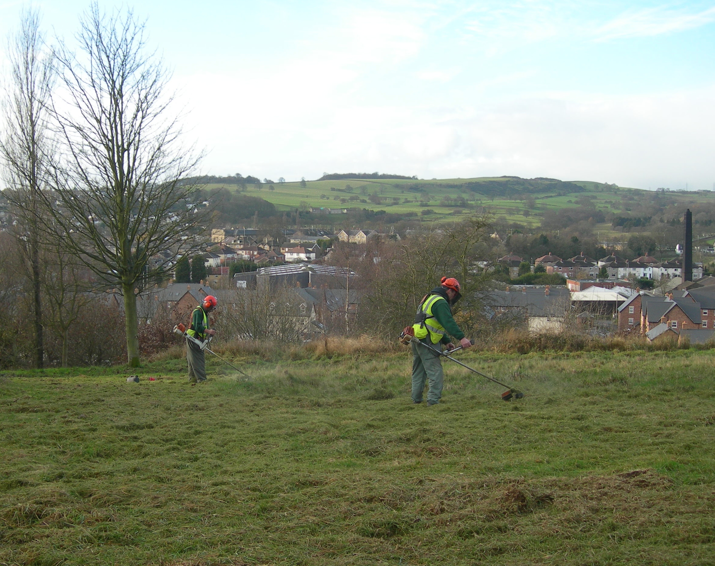 Day 2 of the regeneration; Peter Stell and Ken Newsholme from Pudsey Landscaping, are hard at work with their strimmers – not quite as picturesque, maybe, as the large scythes that used to be used for such a job !! The first task is cutting down the clumpy grass, a feature of land used by ‘many dogs’, clearing the entrances, and making the paths wider and more visible, so they don’t turn into muddy tracks with the wetter weather.