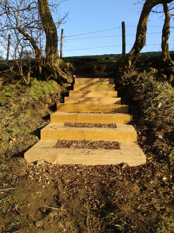 As well as good progress on the Farm Gate we commented on the steps going up at the Hill Side end of the Bridleway. I am sure many of you will recall the experience previously associated with this particular entrance. Requiring a physical dexterity usually associated with an Olympic gymnast coupled with a generous element of good fortune one was always rather relieved to get through unscathed. We now have the foundations laid for a pleasant and gentle descent down well laid out wooden steps. Nice!