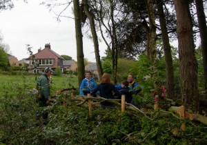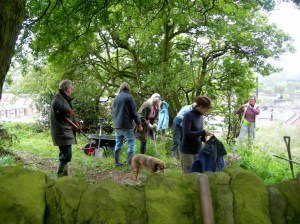 The work parties fell into four groups. In the copse, the Scouts built a new compost bin out of wood donated by B&Q Keighley. Over at the Oxford Road entrance, Sue Jackson and Steve Magson, soon had a deep, straight, ditch dug, to take the artistically arranged logs from the felled sycamore – “the Scouts did really well, bringing all those heavy logs up the hill”, Sue beamed.