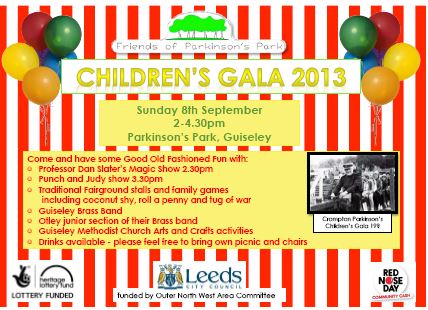 Crompton Parkinson’s held their first Children’s Gala in 1949 in the Park. This became an annual event, much loved and looked forward to by the children of staff, and local children lucky enough to be have tickets. The last gala was held sometime in the 1990’s (does anyone remember the exact year?) . The Friends of Parkinson’s Park are pleased to announce that in 2013, the Gala will be brought back to life – kindly funded by the Leeds Outer North West Area Committee, and Comic Relief Community Cash.