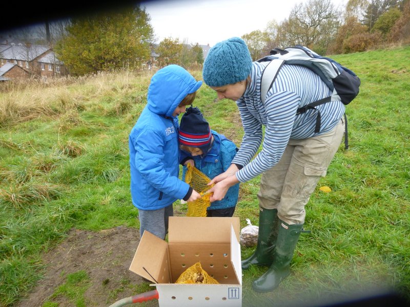 The bottom boundary of Parkinson’s Park was a hive of industry this morning with a great number of folk joining in with the spring bulb planting . We were fortunate to receive 1000 narcissus bulbs free from Groundwork Trust and with everyone pitching in they all got planted in less than an hour, just finishing before the heavens opened.