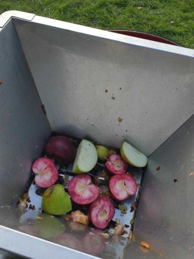 We got a real production line going in the Park this afternoon, with a number of people joining in to turn apples from their own trees, and those in the Park, into juice. We even had a very unusual apple from one of Park’s apple trees, Red Devil – deep red on the outside and the inside.