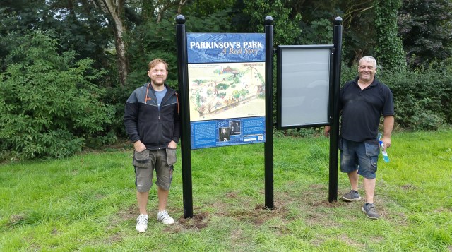 Parkinson’s Park had the first Guiseley heritage interpretation boards put up today (23rd August 2018), the culmination of a Queen’s Diamond Jubilee heritage project sponsored by the Heritage Lottery Fund and run by Jennifer Kirkby and Barbara Winfield of FOPP.