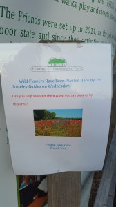 When the Bellway Estate was built the Friends suggested that the meadow at the bottom of the Park was restored – as it had been in the past. The area was duly landscaped back into a hillside by Bellway with plans passed for a path to come from the estate, up through the meadow and join the Greenshaw Terrace Path. The area was then planted up with rough grass, clover, vetch, birdsfoot trefoil and other early meadow establishing plants. We called it Suzannah’s meadow after the several ladies of that name who owned and farmed the land in past centuries.