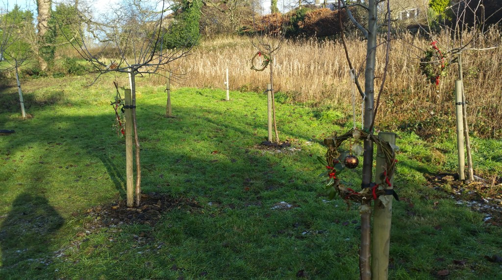 Over Christmas we put wassailing (good health) wreaths, made from willow from the the Park, in the apple trees of the community orchard.Then today, Twelfth Night, the trees have been wassailed or blessed.