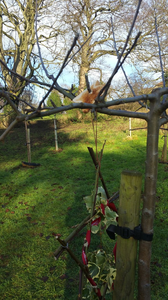 Then the wassailers gather round the biggest and best tree (this was the one which had the Elf house and which the children visited over Christmas), and as a gift to the tree spirits, a piece of wassail soaked toast is placed into its branches, and apple juice or cider is poured over the roots accompanied by songs. We learnt about this ceremony from attending pruning courses run by the Orchard Project.