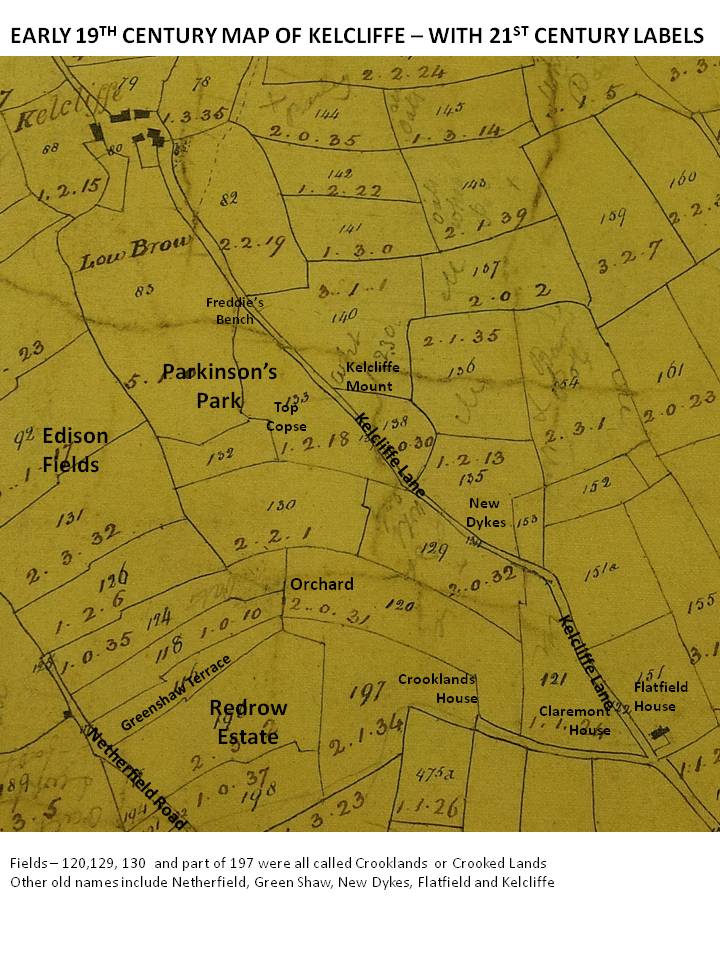 The area of fields called Crooklands (field number 120, 129, 130, 197) ran from the Greenshaw area to the west side of Claremont, which is why the house named Crooklands is where it is. Below is a map from around 1825. On earlier maps the fields had been subdivided into narrower strips than this.