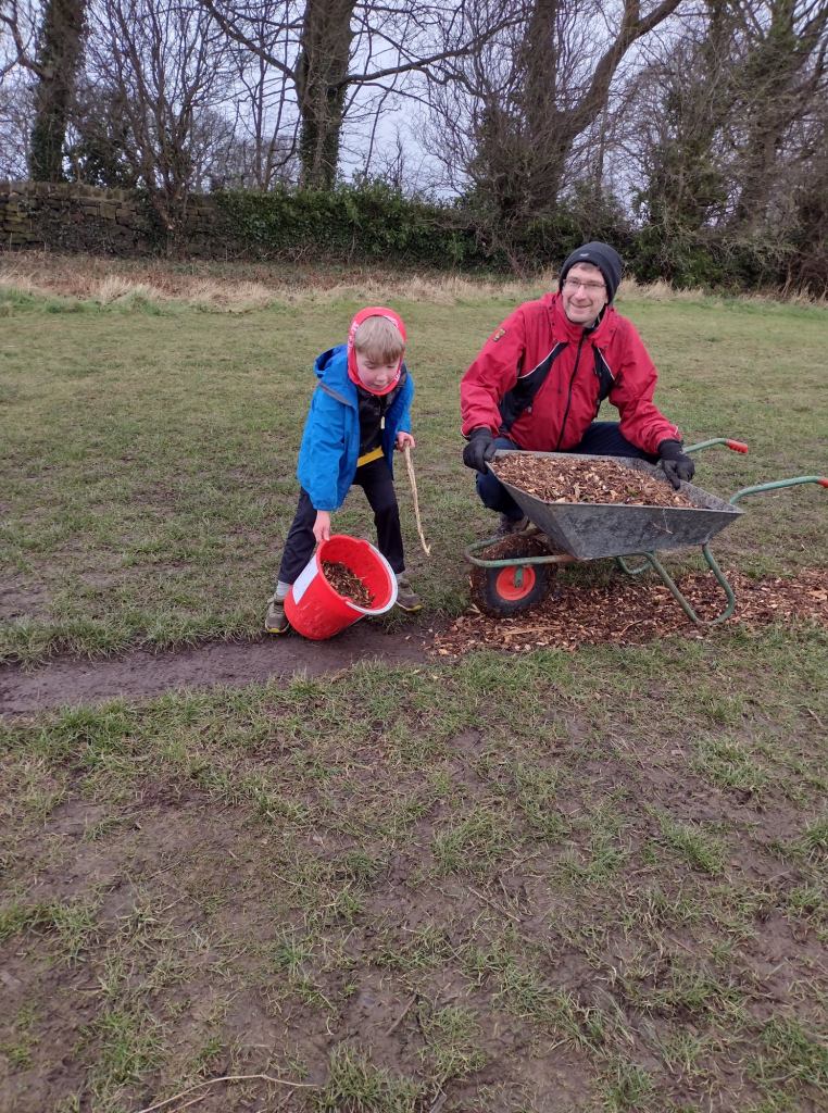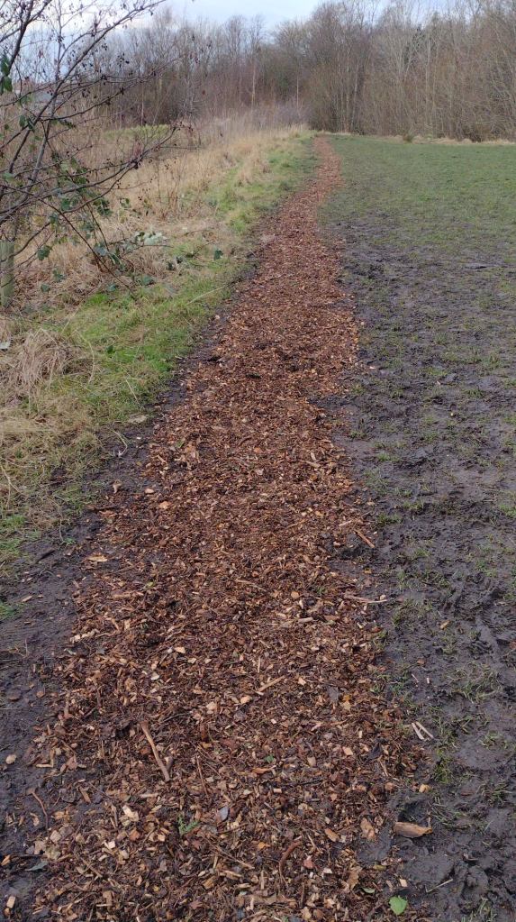 The Park, as many will know, get’s very muddy and slippy in winter and wet weather, so when we can get hold of woodchip and manpower we spread it on the paths – some more was added in the wet on Saturday.