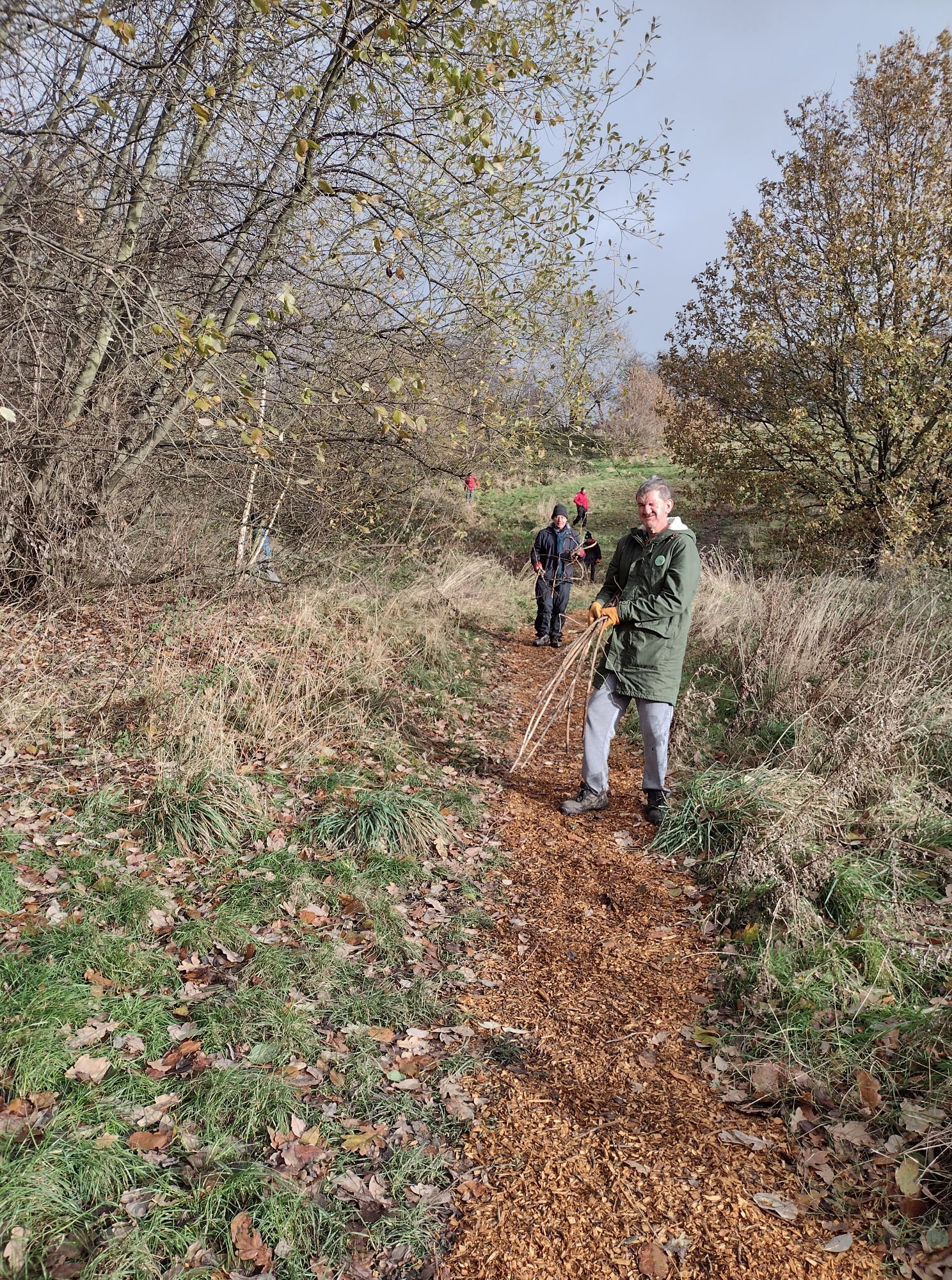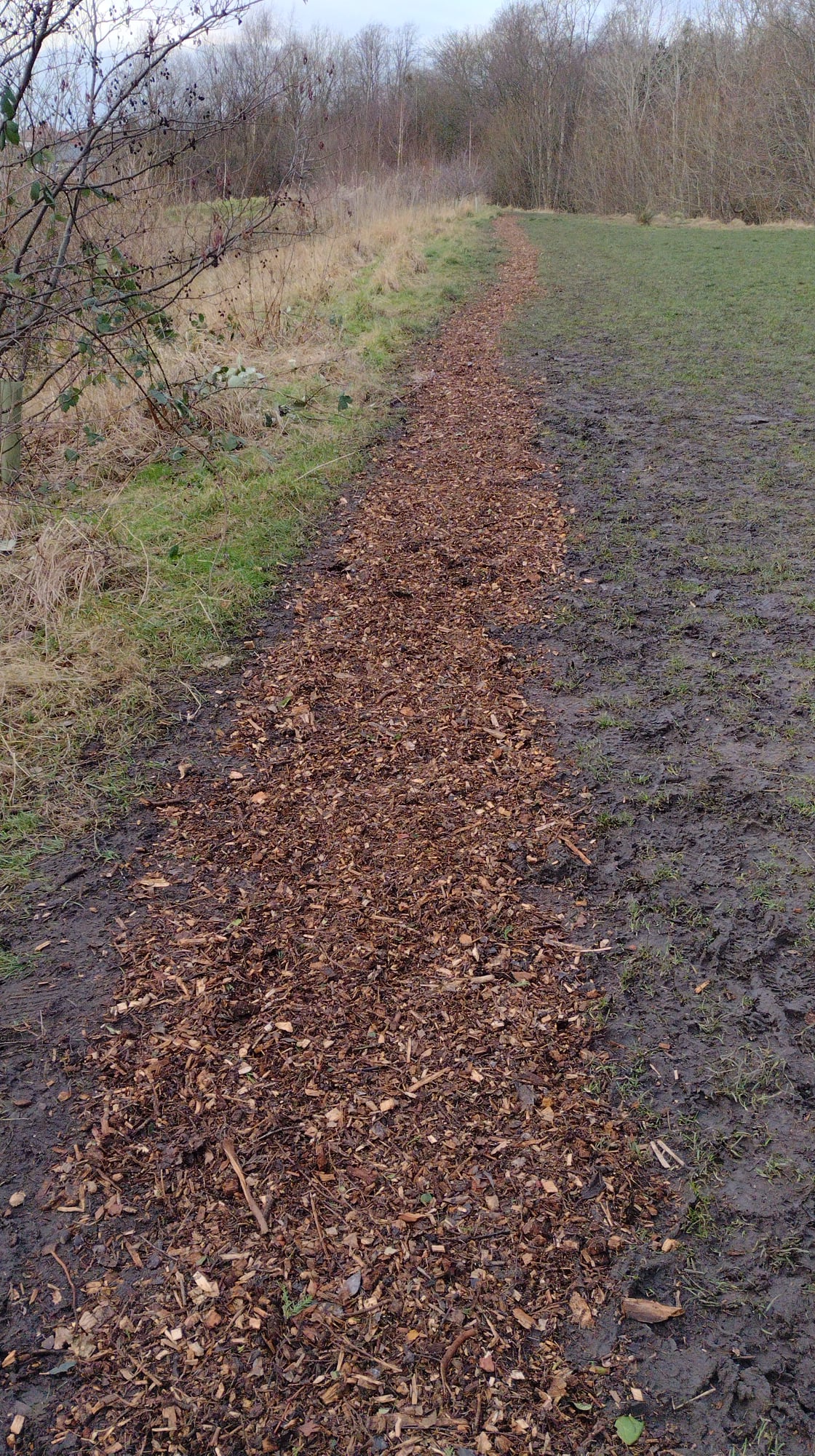 The Park, as many will know, get’s very muddy and slippy in winter and wet weather, so when we can get hold of woodchip and manpower we spread it on the paths – some more was added in the wet on Saturday.