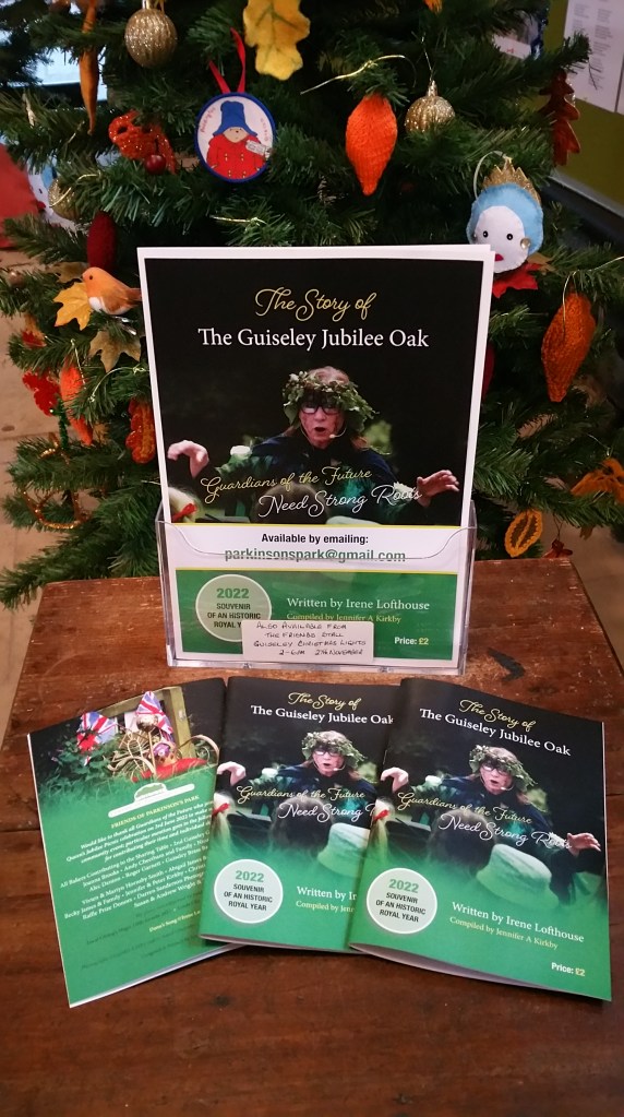 You will find the illustration at the end of our Forward on the Jubilee Tree and the Queen’s Green Canopy, before we open out into Danu’s Song telling the hidden story of trees in the Guiseley Gap throughout time; how they’ve interacted with our ancestors and what they’ve seen – culminating in their new baby sibling The Guiseley Jubilee Oak, planted for Queen Elizabeth II.