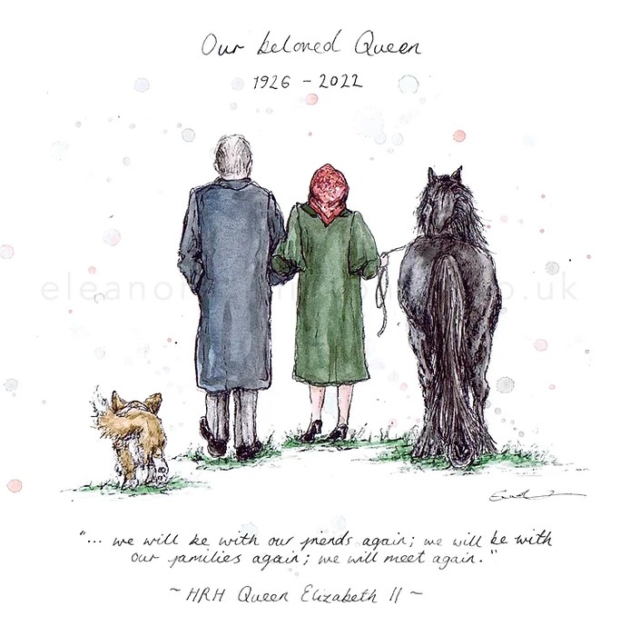 Yorkshire based artist Eleanor Tomlinson drew several illustrations at the death of the late Queen that superbly captured the mood of the nation, and spread like wildfire across social media. (Unfortunately some people then used the illustrations on commercial goods without paying the copyright fee, which is akin to stealing.)