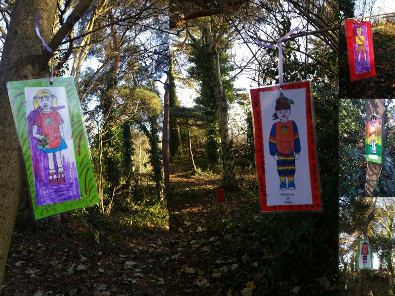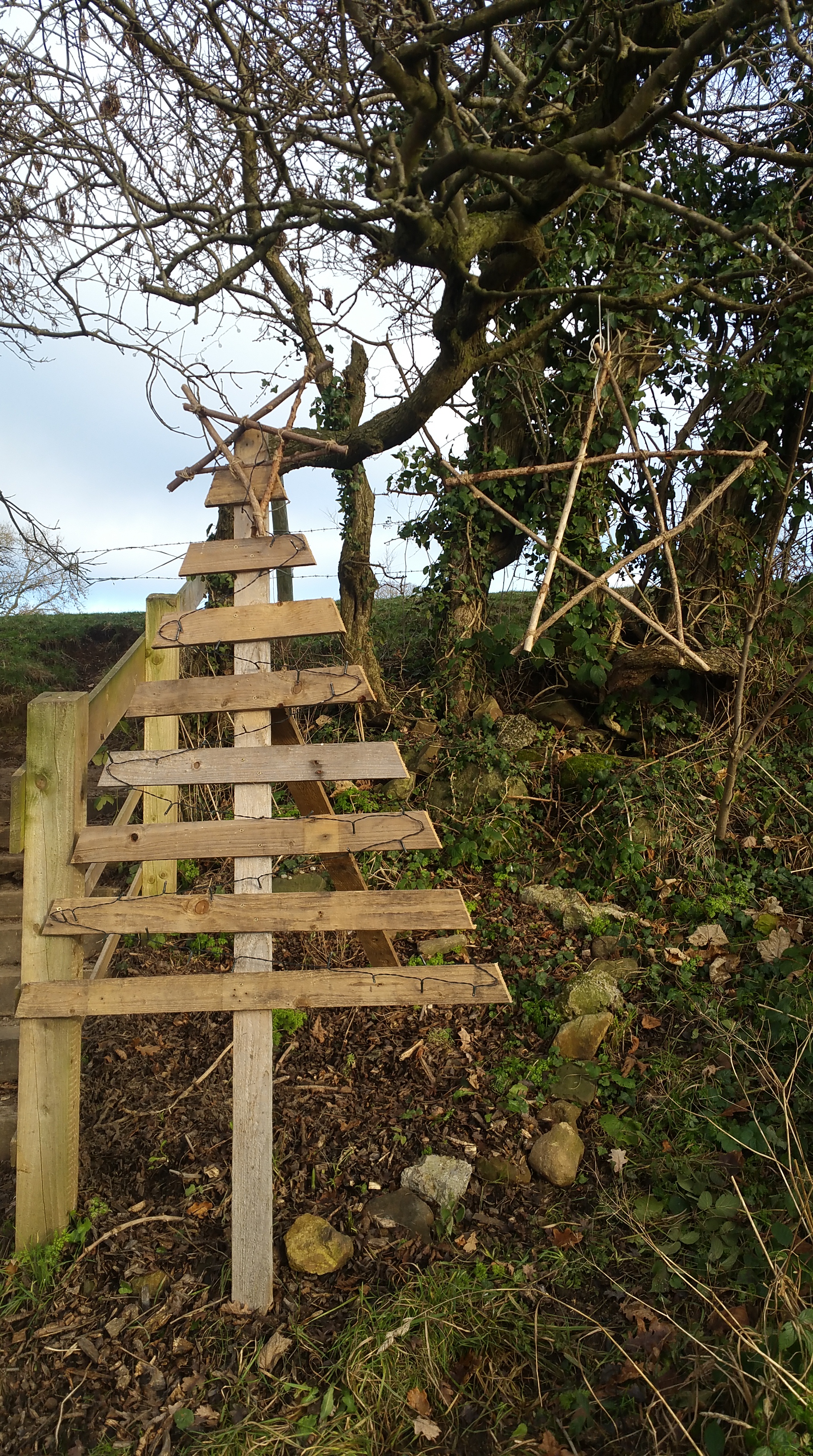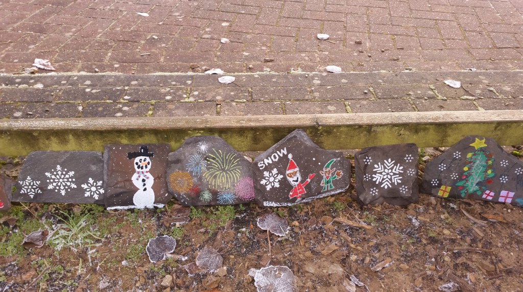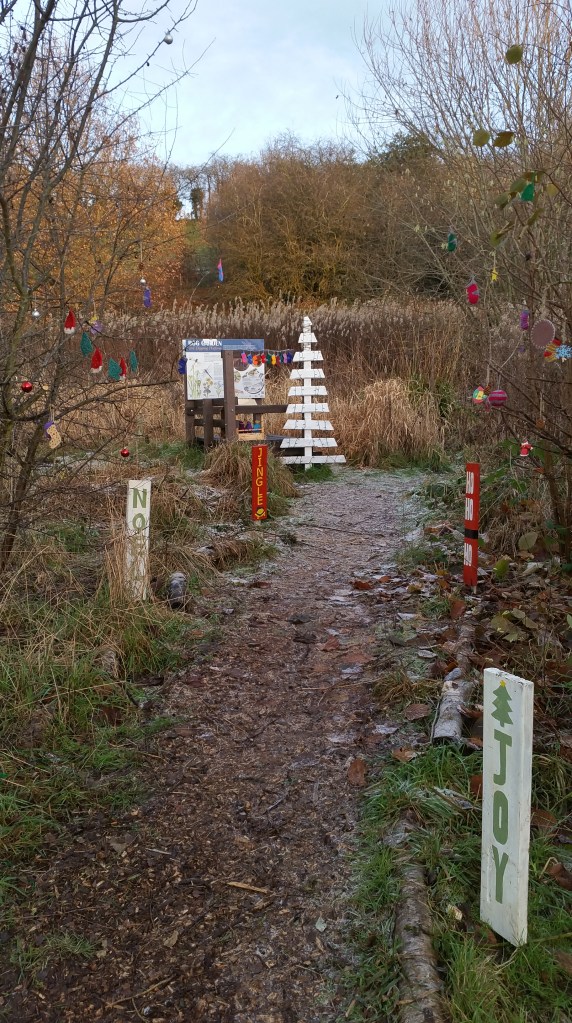 Down in the south, the stark metal kissing gate near the human homes has been bedecked with artistic talent. Colourful winter wreaths greet travellers passing through, ribbon and ivy twist traditionally together around the bars, and there is a lovely little gallery of seasonal pictures on slate to stop and admire. The materials have been gathered from sheds, charity shops, Esholt woods, the Park. It was created by Amy Llewellyn and family who all helped with items, artwork and construction. Ā