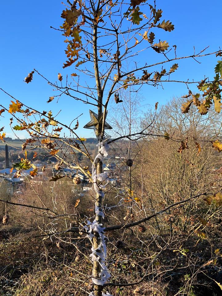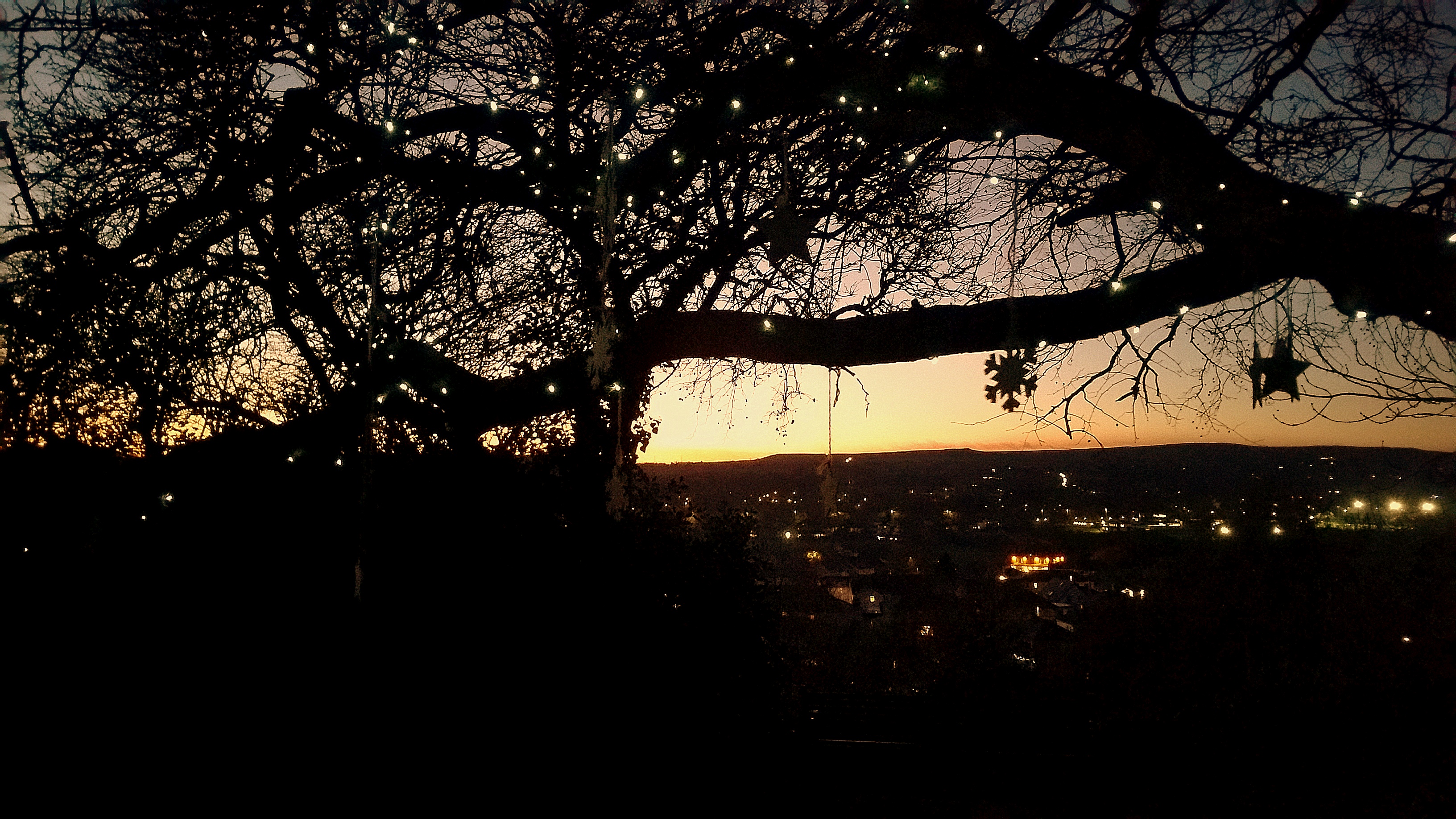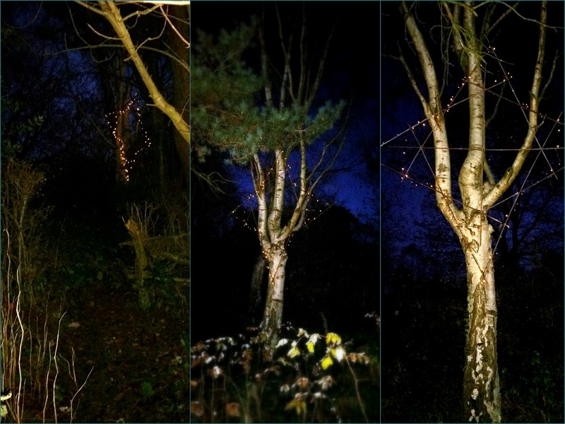 If you walk in the Park near twilight, anything from 3.30pm at the moment, you might spot lights amongst the Scots Pines near Clapper Brow wood. Following those lights to the entrances of the Guiseley copse you’ll spy a giant star, put up high on a birch by David Alcock and Glen Pickburn.