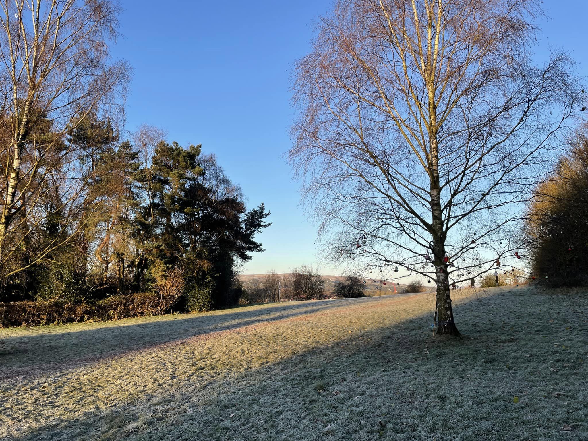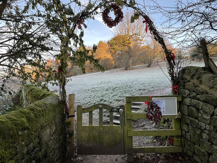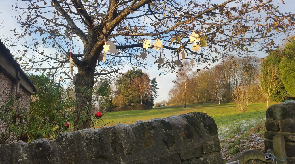 Christmas past is also a theme at the entrance we call the Sheepfold on Kelcliffe Lane, Joanna Brooks hangs stars and snowflakes with twinkly white lights every Christmas season. Each one is dedicated to a pet or human that a park user has loved and who is no longer with us. They swing in the wind watching over the Guiseley Gap during the day, and observing night fall as the sun sets and the lights glow in homes by night.