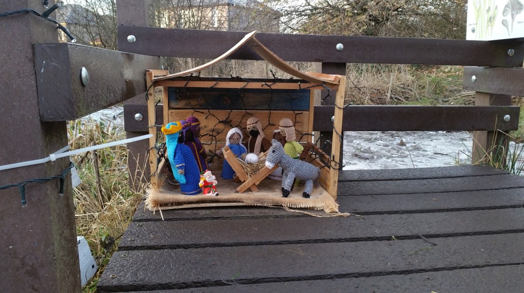 Ā Becky James, Richard Dykes, their families and Nethercliffe neighbours have hung up their Christmas stocking and created a Christmas wonderland hidden amongst the shrubs of the Nethercliffe Entrance. All the items are hand crafted with a beautiful little Nativity scene in a stable at the centre – although the donkey does look rather surprised to find Santa Clause there !! Joy is their message.