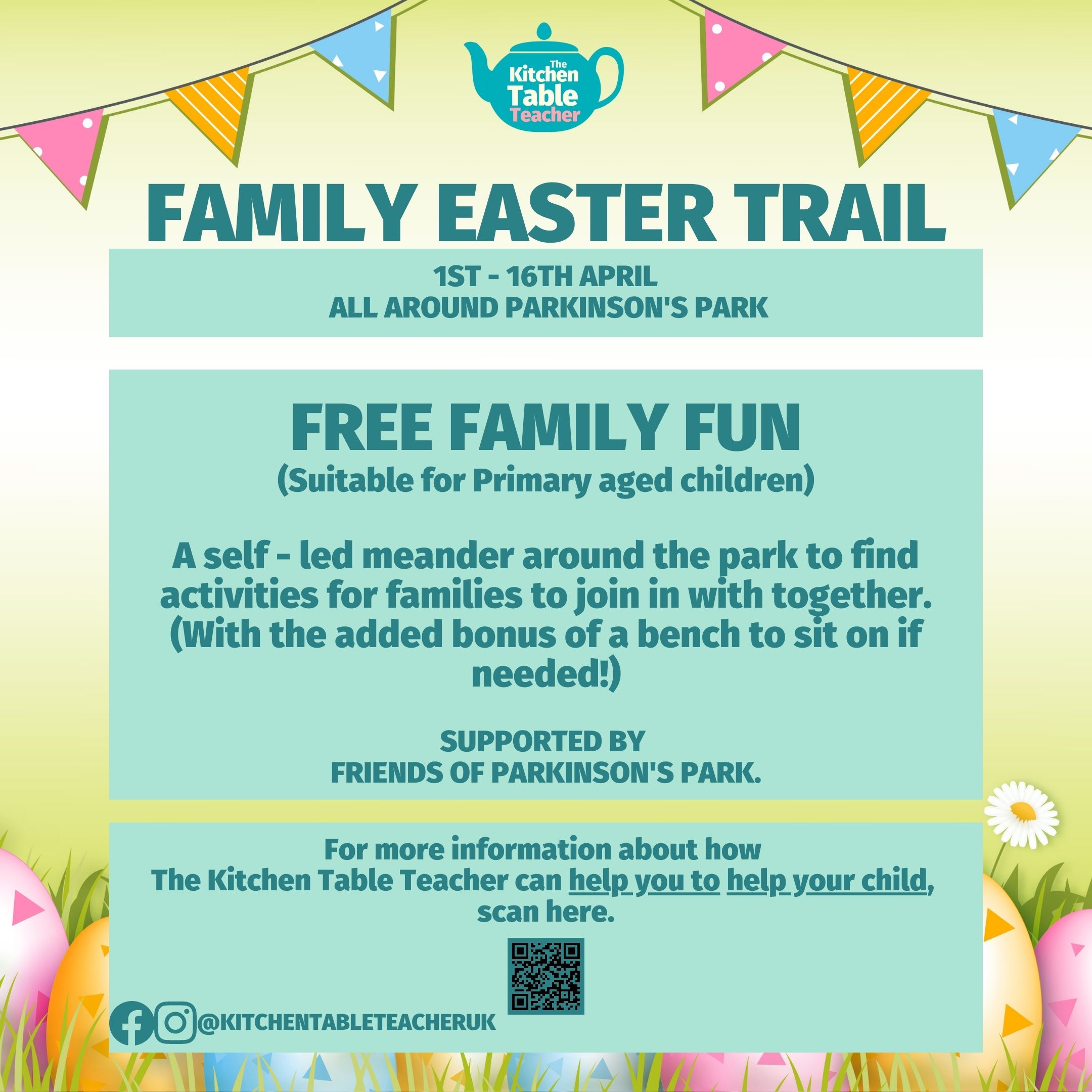 Kitchen Table Teacher (whom you may have seen at the Children’s Gala) will be running an Easter Trail in Parkinson’s Park for Primary age children over the Easter holidays, with educational activities at each of the Park Benches.
