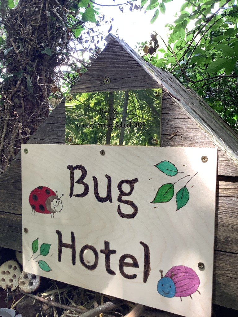 Another casualty of vandalism was the old bug hotel, which had been made by the local cubs. However, we are very pleased that Year 4 from Guiseley Primary School helped us create a lovely new one in July. The hotel is in the top copse which was cleared and tidied. Then it was built using waste wood and pallets, the children then filled it with a variety of bricks, pipes, wood and cones – donated and collected by various people.