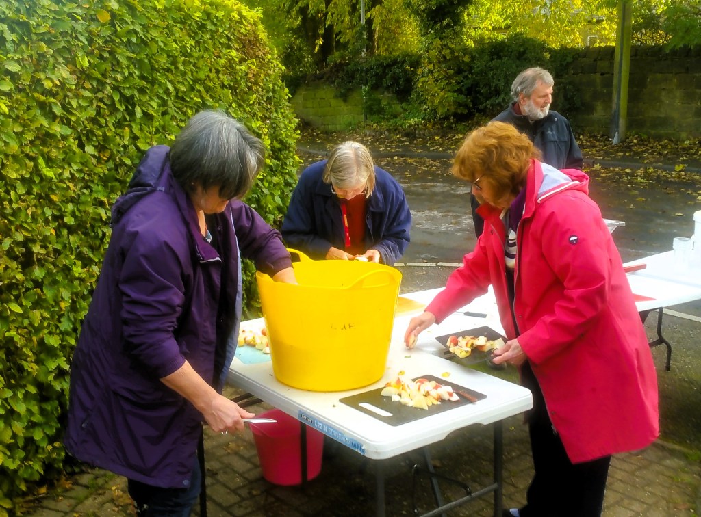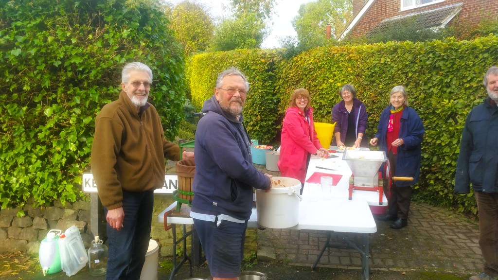 How lucky were we with the weather this afternoon? It’s been a golden, autumn Sunday, and nothing better than having a good natter as we worked in a team to wash, chop, scratt and press the apple juice from local apples. It can now all be frozen for winter culinary use.
