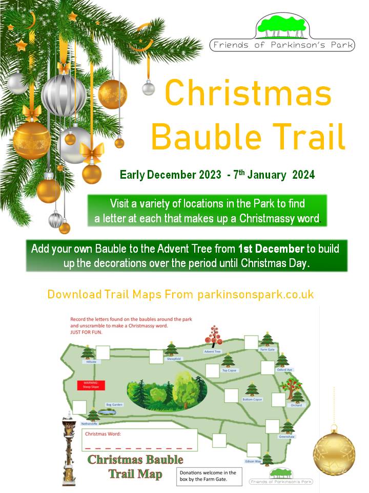 Park Christmas Lights and Bauble Trail – The start of Advent sees the Park Christmas Light Trail back by popular demand. Visit a variety of locations to find a letter at each that makes up a Christmassy word. Trail leaflet here. Each location will have been dressed for Christmas by a different team. This includes the memory corner, where stars and snowflakes blow in the breeze, each one a memory of a loved one or pet. If you’d like to dedicate a decoration contact Joanna Brooks on parkinsonspark@gmail.com